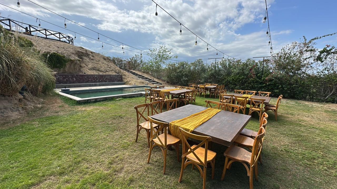 Servicios: Baños, Asador, Cocina, Estacionamiento, Refrigerador. Mobiliario y Camino de Mesa.